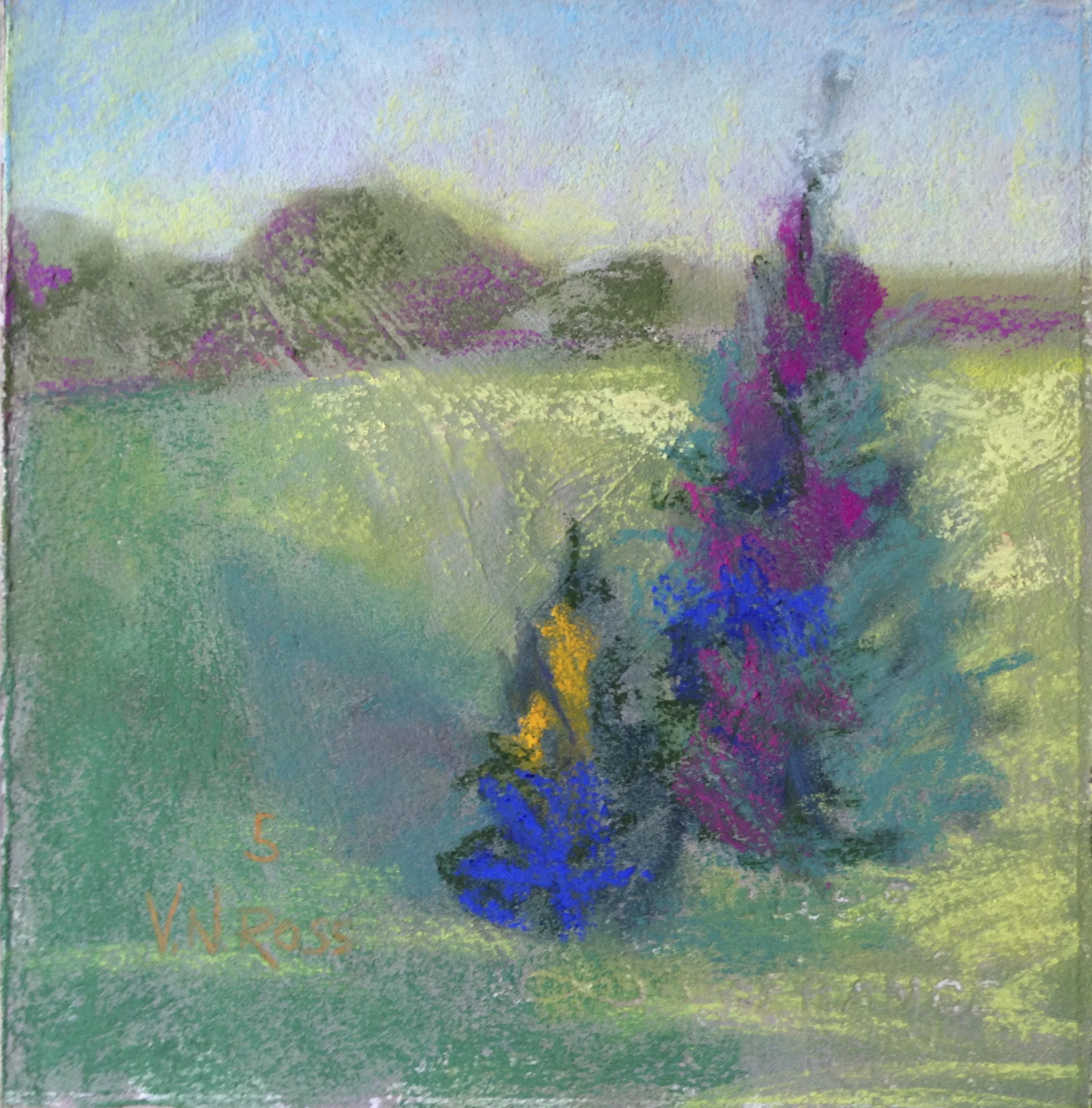 #5 is the one in the middle, over the umber pastel ground. I deliberately left some texture. This one is all pastel...and I was more interested in the colors than anything else. I really like how glazing with the side of a 1/2" stick really accents the texture in the ground.