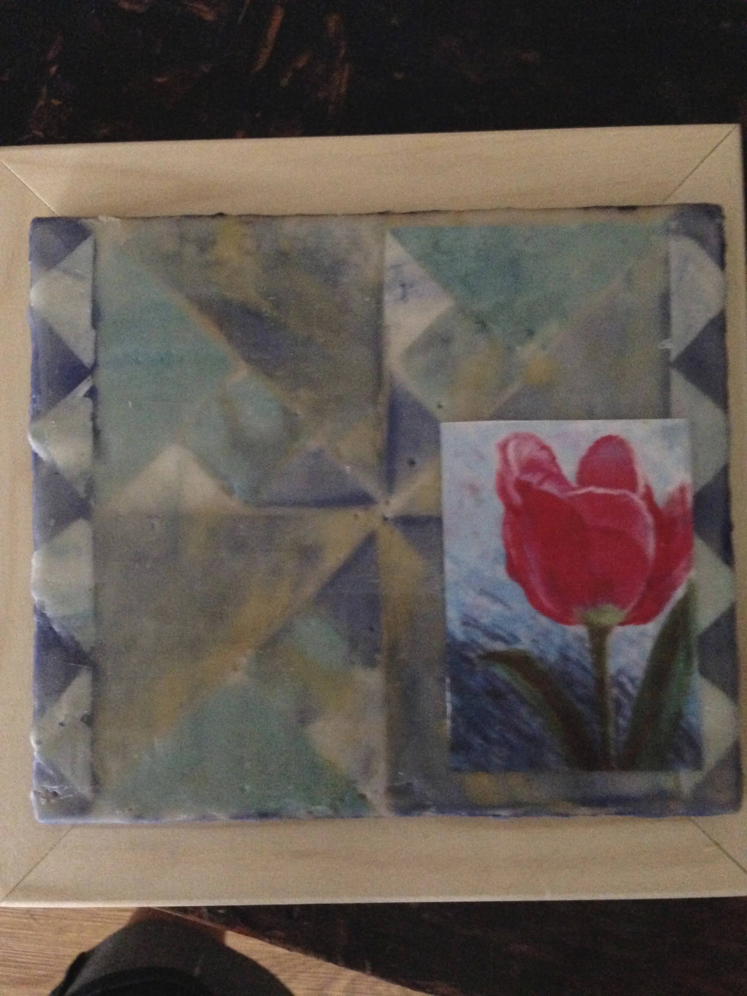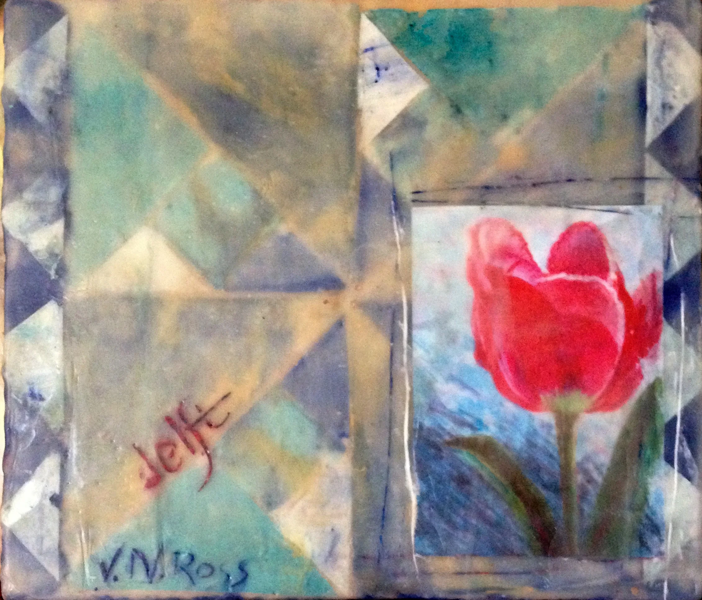A quilt square named Delft Mill fit with the Tulip. Color scheme? Used Robert Burridge’s Goof Proof Color Wheel. I have the app, and it is a great tool! Working with plain encaustic medium, I scraped a bit from soft pastel sticks to get my color quickly. Sometimes you don’t need much, and it is easier than mixing. Worked great and I like the faint granulation.