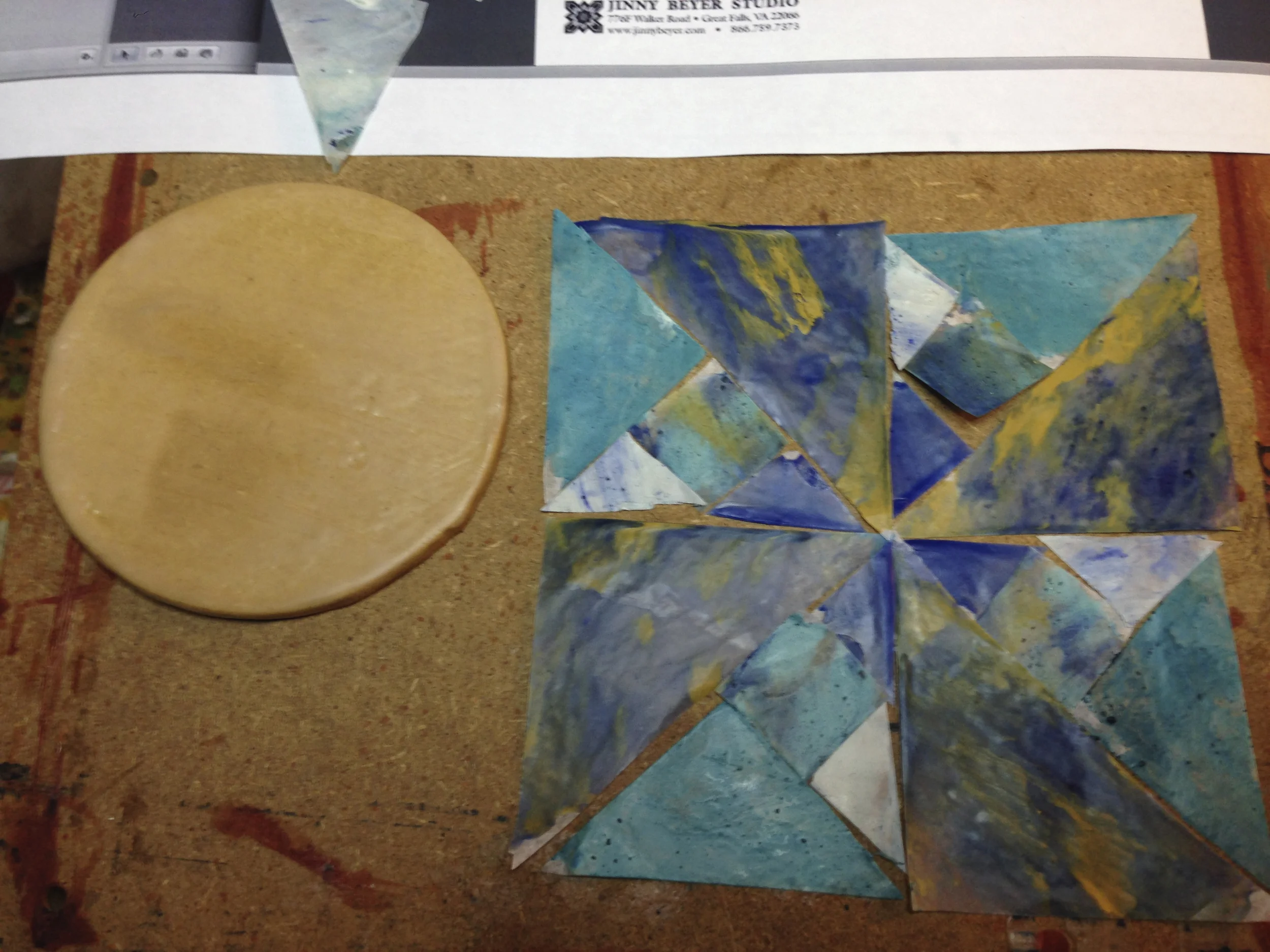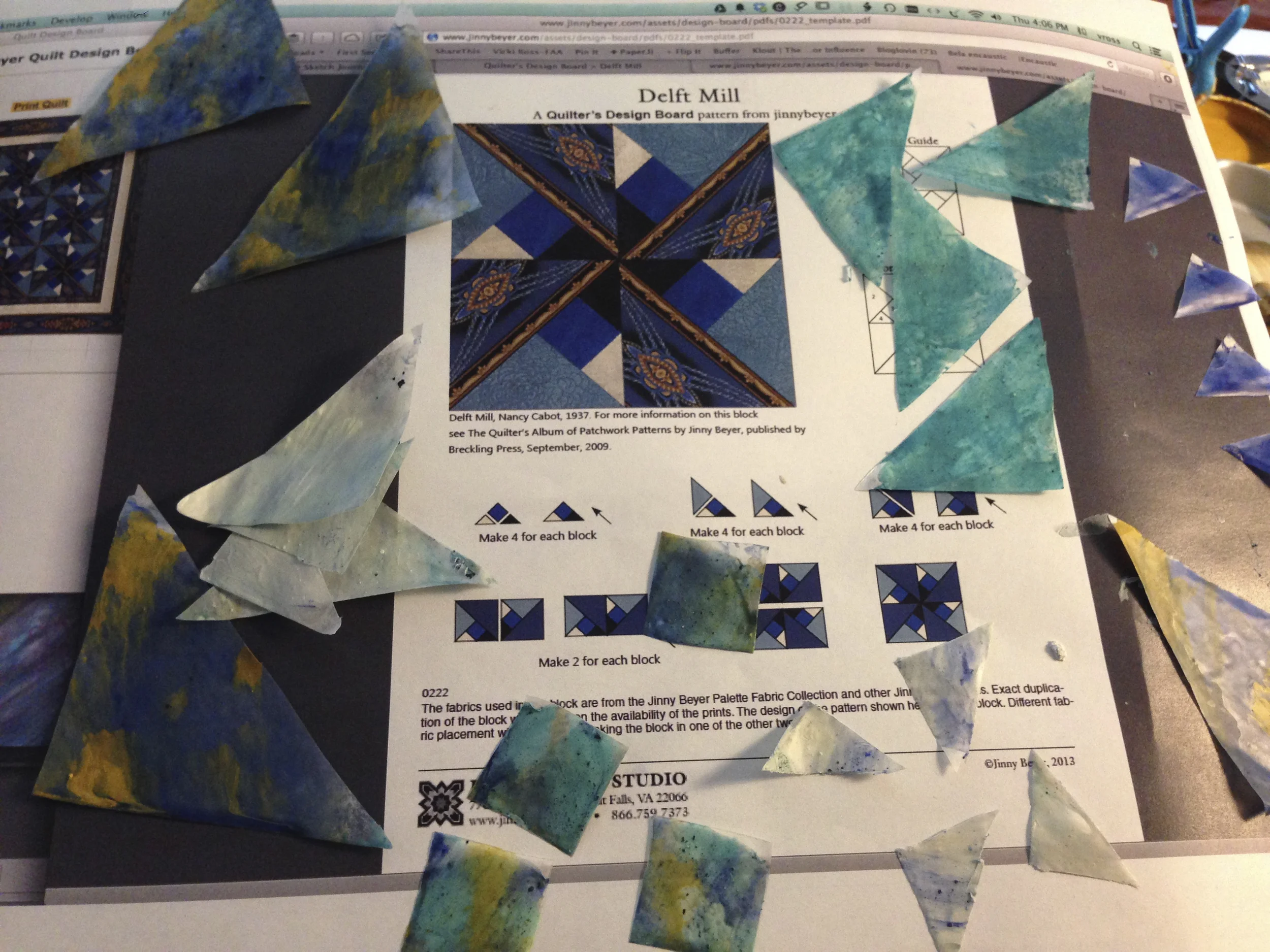 Here you can see the pieces all ready for “quilting” onto the prepped board, and a trial piecing. Then I moved them to the board in position.