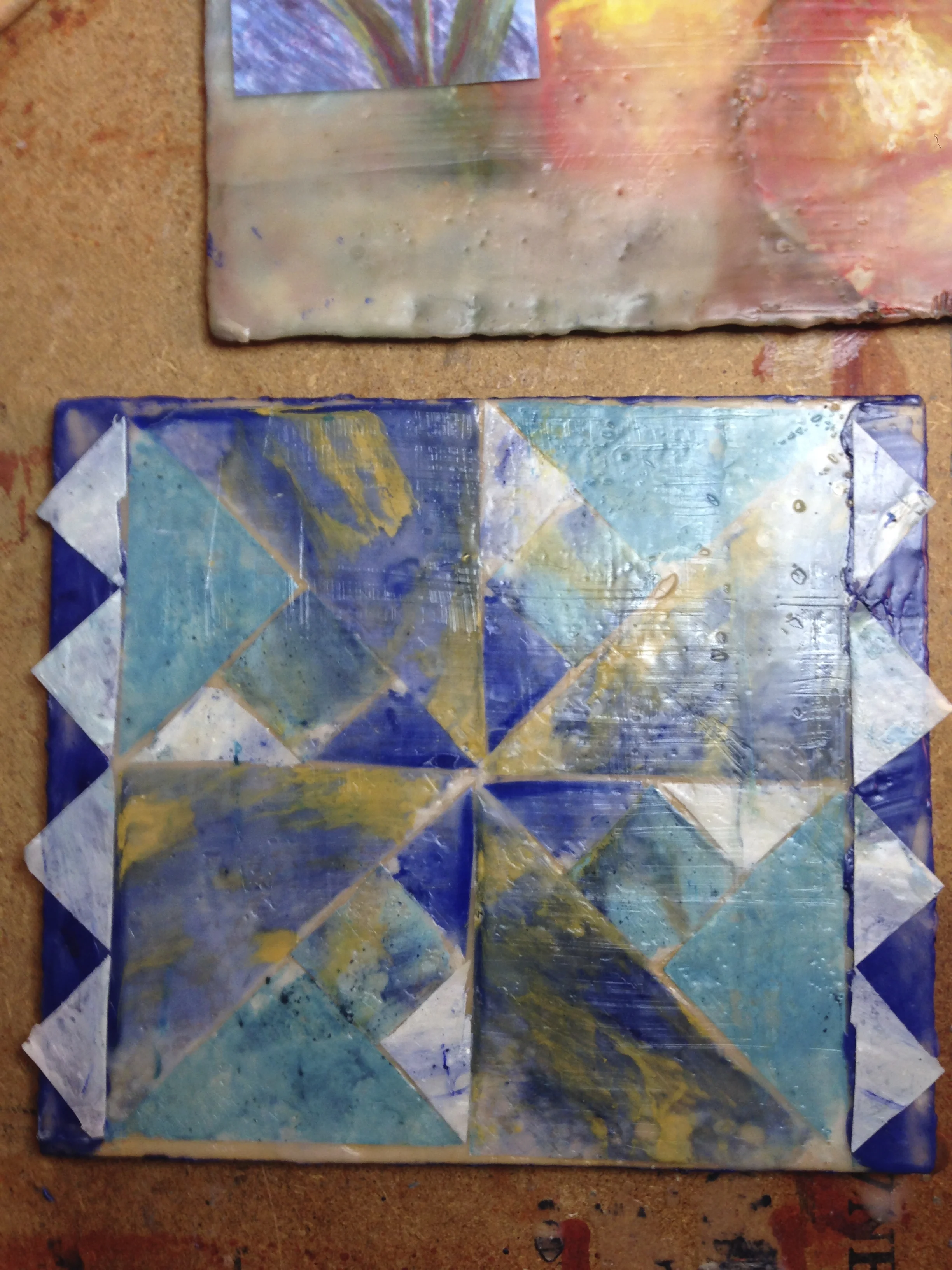 Once a fiber artist, always a fiber artist. Although I worked with silk thread and the smallest silk gauze for needlepoint (40 stitches per inch), this is a quilt pattern created in deli paper and encaustic.