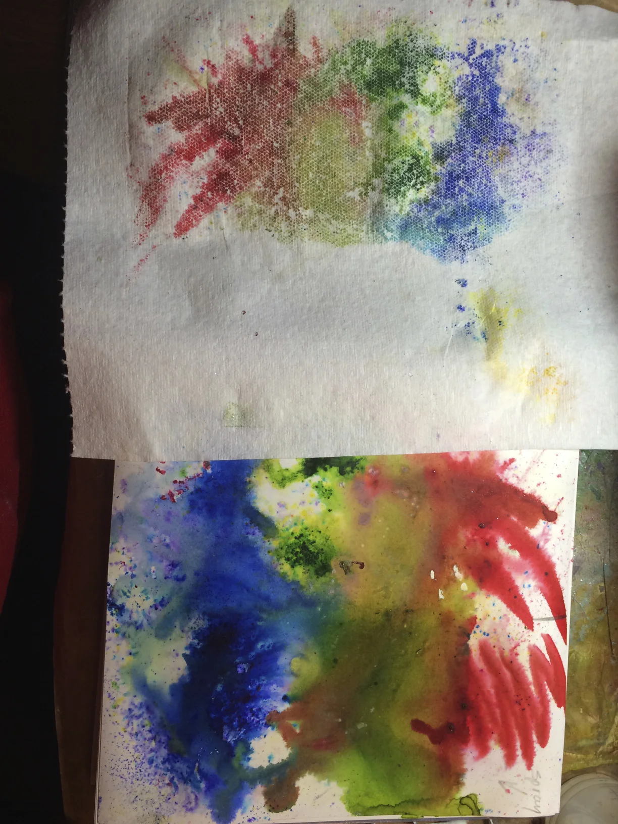 Next, I sprayed with the water bottle again and put some deli paper on top. The un-fixed side pulled some color, while the fixed side only got a bit from the top...probably where I didn't hit the fixative good enough. Next, I re-wet it and used a paper towel this time. Violå! You can see the unfixed pigment stain the towel.